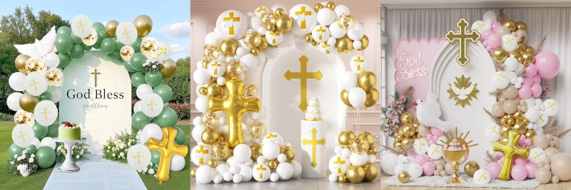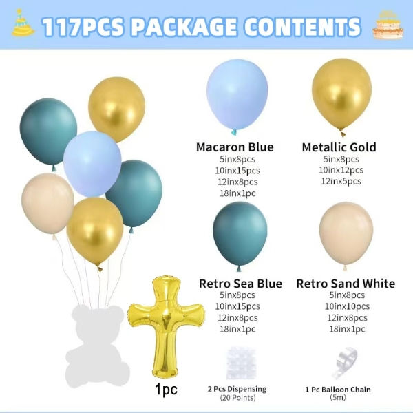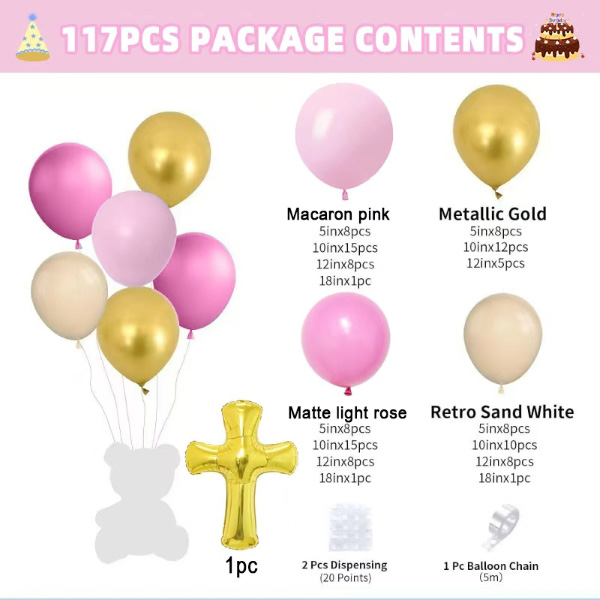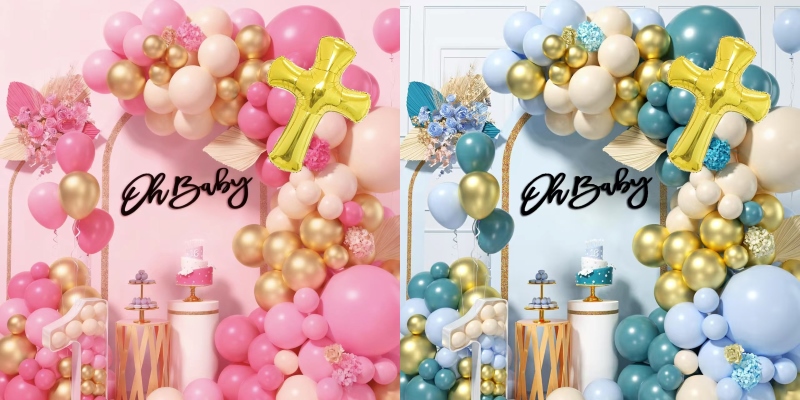 Baby shower -ilmapallokaarisarjoissa on kaksi tyyliä, joista yksi on tytöille ja toinen pojille. Tyttövauvan setti on valmistettu makaronin vaaleanpunaisesta ilmapallosta, mattaisesta vaalean ruusunvärisestä ilmapallosta, matta vaaleasta ihonvärisestä ilmapallosta, metallisen kullanvärisestä ilmapallosta ja kultaisesta jumalan siunausta -rististä. Poikasetti on valmistettu makaroninsinisestä väripallosta, retromerensinisen värisestä ilmapallosta, matta vaaleasta ihonvärisestä ilmapallosta, metallisen kullanvärisestä ilmapallosta ja kultaisesta jumalan siunaamaan rististä. Molemmissa on liimapiste ja ilmapallomatka, joista voit tehdä kokonaisen kauniin seppeleen.
