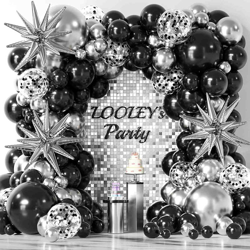 4. Yksityiset ja ainutlaatuiset räätälöidyt mustien ja hopeisten ilmapallojen seppelesarjat.