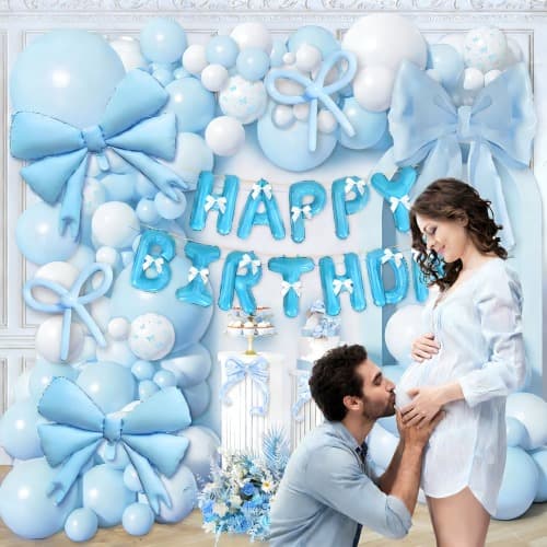 Tämä setti sisältää 5 tuuman, 10 tuuman, 12 tuuman ja 18 tuuman makarooninsinisen ilmapallon, mattavalkoisen 5 tuuman, 10 tuuman, hyvää syntymäpäivää bannerin, foliomakarooninsinisen jousiilmapallon, makarooninsinisen 260 pituisen ilmapallon, nauhajousen, liimapisteen ja ilmapallon koristenauhan.