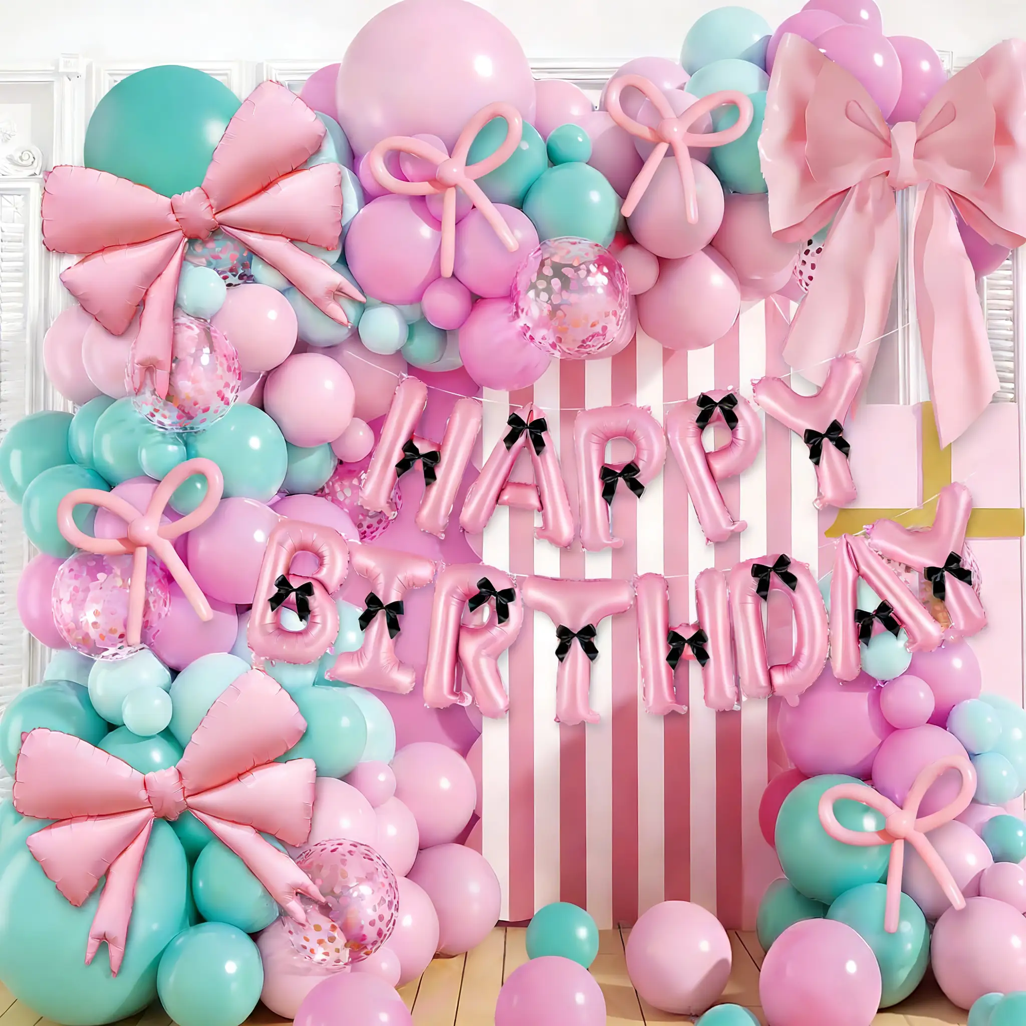 Tämä setti sisältää macaroon pinkin, macaroon tiffany blue, macaroon rose red, matta ihon pinkki ja matta tiffany sininen värit. Siinä on 5 tuuman, 10 tuuman, 12 tuuman ja 18 tuuman ilmapallo. Liimapiste ja ilmapalloliuska voivat auttaa loppuasiakkaitasi helpottamaan tämän setin kokoamista. Foliojousi ilmapallo, musta nauha ja 260 pitkä ilmapallo ovat tämän setin silmäosia.