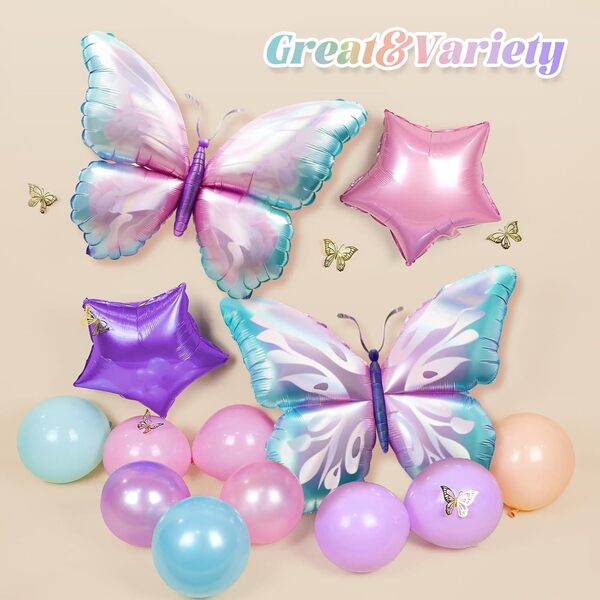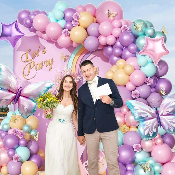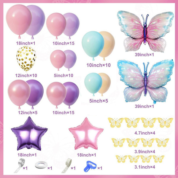 Butterfly balloon arch kit: Kaarisarja on värikäs ja silmiinpistävä, se koostuu erilaisista folioilmapalloista ja lateksipalloista. Kun järjestät sen, lisää taustataulu, jossa on kuvioita ja erilaista tekstiä, ja ympäröi sitten ilmapallot sen ympärillä. Se on tapahtuman tunnelman luoja. Valokuvien ottaminen sen edessä näyttää erittäin kauniilta.