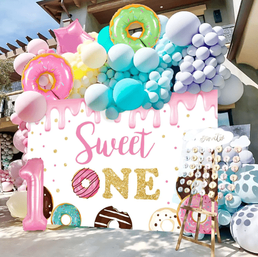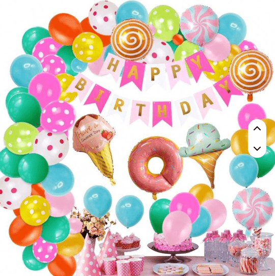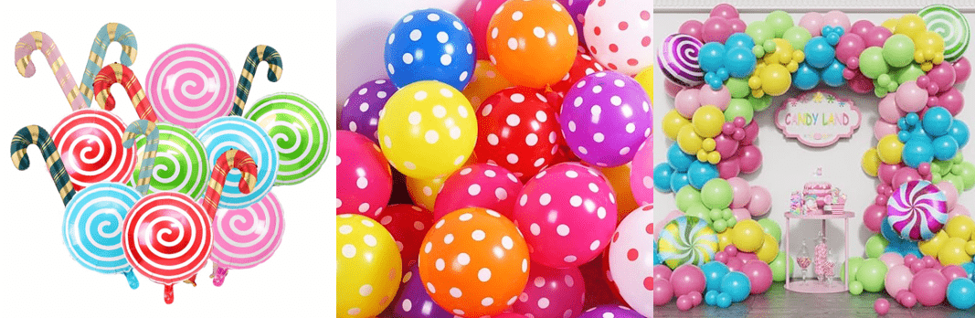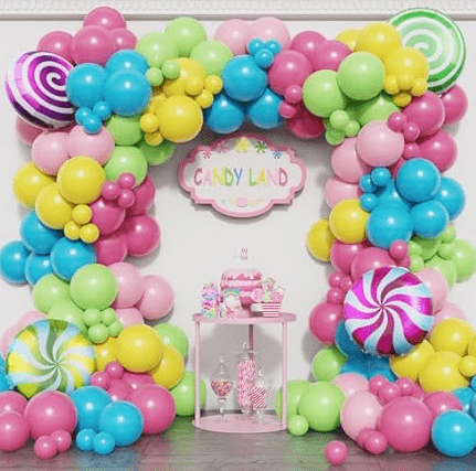 Karkkiteemainen ilmapalloseppelesarja, jossa makean unelman karkkiväri ja suloinen tikkarimuoto ovat sisustuselementtejä, yleistyyli on eloisa ja suloinen.