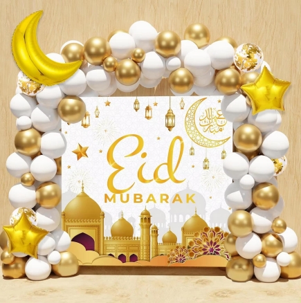 Äskettäin esitelty Eid al-Fitr -ilmapallosarja lisää taustakankaan, pöytäliinan ja muita tuotteita aiempiin perusvaraosiin. Taustakankaassa on käytetty klassisia Eid al-Fitr -elementtejä, kuten kullattu puolikuu, arabialainen "Eid Mubarak" ja Lonicera japonica -kuto. Taustaväri on pehmeä valkoinen tai vaalea kamelinväri, joka ei vain säilytä festivaalin pyhää tunnetta, vaan yhdistää myös perhejuhlan lämpimän tunnelman. Se ripustetaan olohuoneen seinälle, sisäänkäynnille tai ostoskeskuksen toiminta-alueelle, ja siitä tulee näyttämön visuaalinen keskus ilman monimutkaista asennusta. Äskettäin lisätty pöytäliina on valmistettu öljyn- ja vedenpitävästä PE-materiaalista, jonka pintaan on painettu symmetrisiä geometrisia linjoja ja reunoilla pilkottuja hienoja tupsuja. Se asetetaan ruokapöydälle, kirjautumispöydälle tai ruokakoppiin. Se ei pysty käsittelemään vain keiton ja jälkiruoan tahroja juhlissa, vaan myös sen juhlakuviot voivat kaikua koristeilla, kuten ilmapalloketjuilla ja lipuilla, mikä tekee koko tapahtumapaikan ulkoasusta integroidumman - ilmapallon Garlandista työpöydän yksityiskohtiin, jokainen paikka välittää Eid al-Fitrin jälleennäkemisen ja ilon.