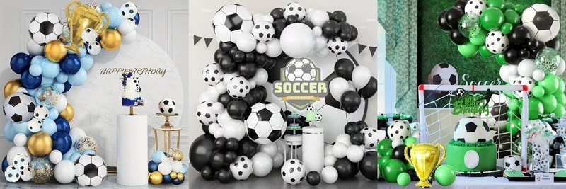 1. Kun muokkaat ilmapallosarjoja, voit käyttää vihreää tai sinistä väriä ilmapalloja ja laittaa niitäjalkapallopainetut ilmapallot, niin siitä tulee erittäin kaunis setti, kuten alla oleva kuva: