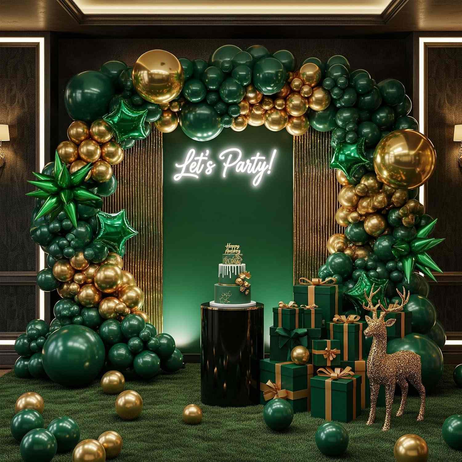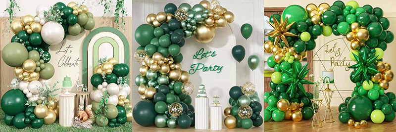 Vihreän ja kullan ilmapallokaari käyttää luonnollisia ja ylellisiä sävyjä pääideana. Vihreän ja kullan sekoitus tekee juhlasta raikkaan ja tyylikkään. Kaaressa on monia vihreitä sävyjä, kuten matta tummanvihreä, retro pavunvihreä, retro avokadonvihreä, retro tummanvihreä ja niin edelleen. Jokainen väri näyttää oman kerroksensa ja tekstuurinsa. Kultaiset ilmapallot sopivat hyvin viheriöiden kanssa. Vihreät tuovat rauhallisen ja luonnollisen tunteen. Kultaiset lisäävät kiiltoa ja ripauksen ylellisyyttä. Kaksi väriä täydentävät toisiaan. Ne luovat hienostuneen ja tyylikkään tunnelman.