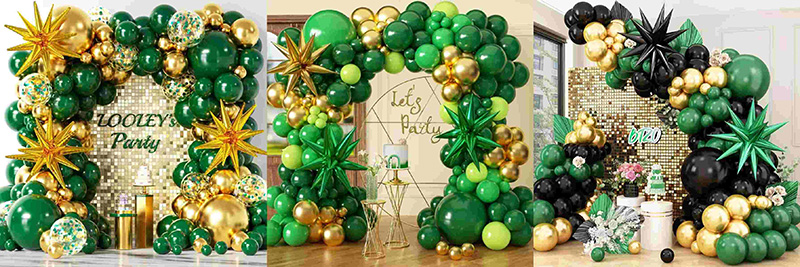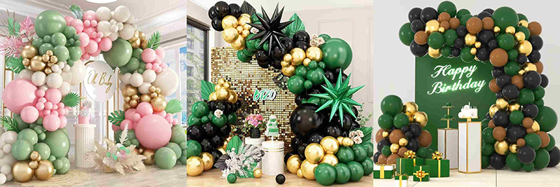 Voit käyttää valkoisia tai päärynänvalkoisia ilmapalloja, joissa on vihreä ja kultainen ilmapallokaari. Siitä tulee pehmeä ja lämmin ja se muistuttaa kevään puutarhan raikkautta; Kun se yhdistetään vaaleanpunaisiin ilmapalloihin, se voi luoda eloisan tunnelman, joka on suloinen ilman, että se on hyytävä, tuoden romanttisen tunnelman vauvakutsuihin ja tyttöteemaisiin juhliin; vaikka yhdistettynä syvempiin väreihin, kuten mustaan ja ruskeaan, vihreät ja kultaiset värit voivat tasapainottaa näiden sävyjen syvyyttä ja vakautta silmiinpistävällä värijännityksellään luoden modernin mutta lämpimän juhlallisen tunnelman.