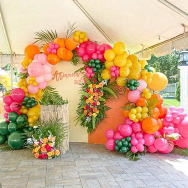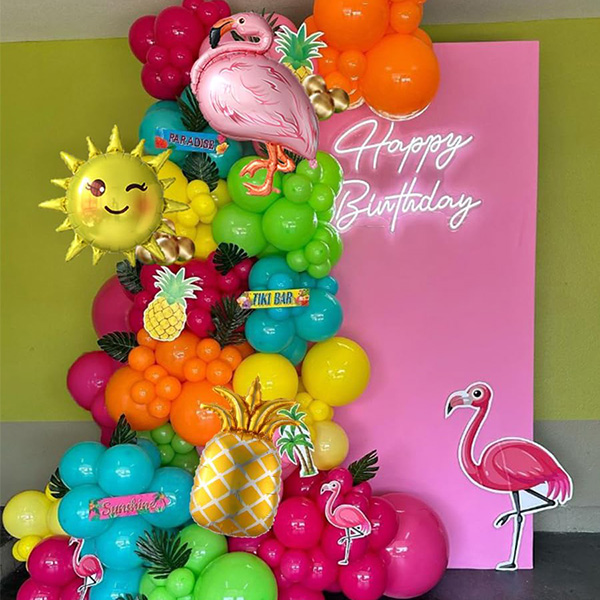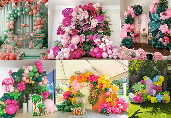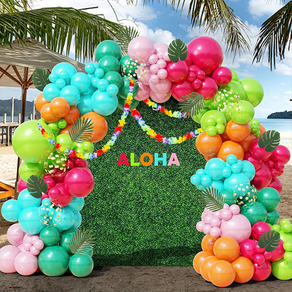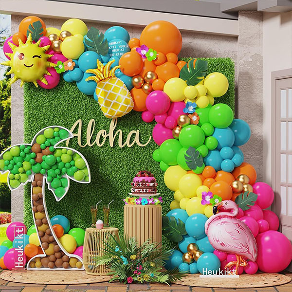 Tämä havaijilainen ilmapalloseppelesarja on valmistettu värikkäistä lateksiilmapalloista. Eloisat värit tekevät siitä täydellisen lasten syntymäpäiville. Sitä on myös saatavilla useissa eri tyyleissä. Mukautetut trooppiset ilmapallokaarisarjat voidaan räätälöidä ja koota haluamaasi tyyliin. Voit vapaasti luoda omia ainutlaatuisia mallejasi ja kokeilla niitä, jotta seuraava tapahtumasi onnistuu täydellisesti.
