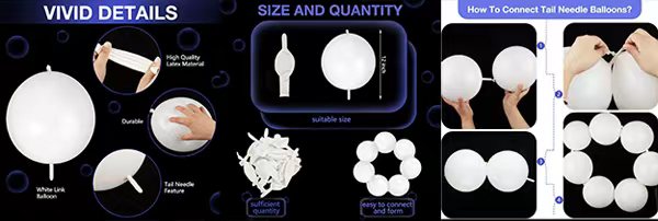 Nopea linkkipallomme erottuvat heidän ainutlaatuisesta päähän -suunnittelustaan, mikä eliminoi työkalujen tarpeen. Perinteisiin ilmapalloihin verrattuna edistynyt linkin ilmapalloyhteysprosessi on yksinkertaisempi ja nopeampi, jolloin voit sisustaa puolueesi tai tapahtumapaikkaasi tehokkaammin.