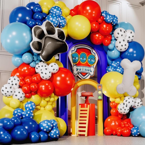 Ilmapallokaarisarja sisältää pilkkutulostuslateksipallot, 5 tuuman, 10 tuuman ja 18 tuuman mattasiniset lateksiilmapallot, 5 tuuman, 10 tuuman ja 18 tuuman mattapunaiset lateksiilmapallot, 5 tuuman ja 10 tuuman mattakeltaiset lateksiilmapallot, 10 tuuman ja 18 tuuman mattapintaiset vaaleansiniset ja 18 tuuman ilmapallot. ilmapallojen tarvikkeet, kuten nauha, liimapisteet, ilmapallonauha ja niin edelleen.