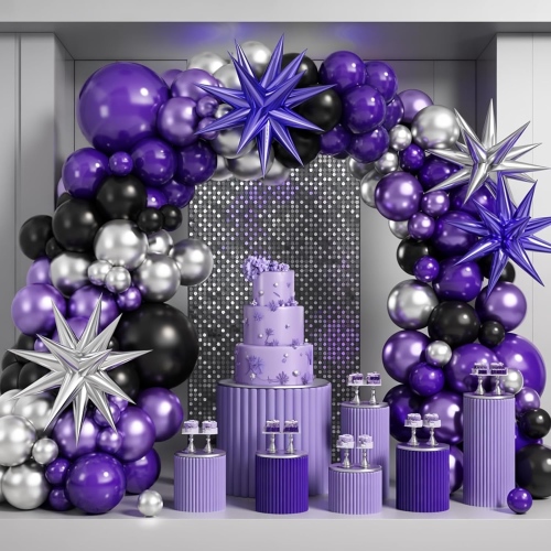 Laadukkaiden purppuraisten ja mustien ilmapallojen seppelepakkausten avulla voit yhdistellä mustia ja violetteja ilmapalloja. Niitä voidaan yhdistää mustiin ja purppuraisiin ilmapalloihin hopeisiin ilmapalloihin tai hopeafolioon ilmapalloihin korostaakseen ilmapallojen seppelekaaren sarjaa. Se sopii erinomaisesti valmistujaisiin, aikuisten seremonioihin ja muihin virstanpylväsjuhliin, ja se ilmentää rituaalin tunnetta, kun jätetään hyvästit nuorille ja astutaan aikuisuuteen. Niitä voi myös yhdistää mustat ja violetit ilmapallot kultaisiin ilmapalloihin tai kultafolioon. Se on ihanteellinen tilaisuuksiin, kuten yritysten vuosipäiviin ja uusien myymälöiden avaamiseen, sillä se huokuu ammattimaisuutta ja hienostuneisuutta samalla, kun se välittää huippuluokan, hyvämaineisen tuotekuvan. Ne voidaan myös yhdistää sinisten ilmapallojen kanssa futuristisen ilmeen luomiseksi. Nämä ilmapallosarjat sopivat erityisen hyvin elektronisiin urheilulajeihin, trendikkäisiin ja scifi-aiheisiin juhliin ja tarjoavat silmiinpistävän visuaalisen vaikutelman.