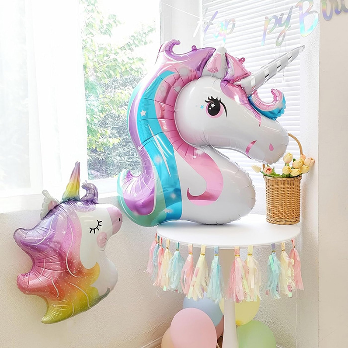Tämä yksisarvisen ilmapalloseppele koostuu pääasiassa lateksi- ja folioilmapalloista. Lateksiset ilmapallot on valmistettu paksunnetusta myrkyttömästä luonnonlateksista, joka on erittäin joustavaa, kestävää ja sitä ei ole helppo rikkoa, mikä varmistaa, että se pysyy täynnä ilmapalloseppeleen kokoamisen jälkeen. Yksisarvinen foliopallo on valmistettu korkealaatuisesta alumiinifoliomateriaalista, painatus on kirkas eikä haalistu, ja se voi säilyttää kolmiulotteisen muodon ja kiiltävän kiillon pitkään.