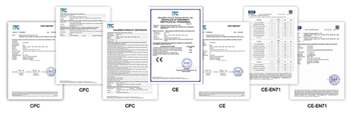 Täysi tuotevalikoimamme on läpäissyt CPC, CE, EN71 ja muut arvovaltaiset sertifikaatit noudattaen tiukasti eurooppalaisia ja amerikkalaisia sekä muita kohdemarkkinoiden turvallisuusmääräyksiä. Nämä pätevyydet voivat auttaa tavaroitasi tulemaan sujuvasti ja välttämään täysin vaatimustenmukaisuusriskit ulkomailla.