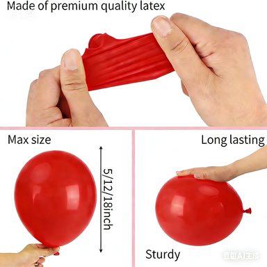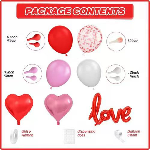 Tämä ilmapallosarja koostuu pääasiassalateksi ilmapallojaja useitafolio ilmapallo. Niiden lateksiilmapallot ovat punaisia, vaaleanpunaisia ja valkoisia. Ne on valmistettu 100 % luonnollisesta lateksista, joka on täysin ympäristöystävällinen ja vaaraton ihmiskeholle. Ja niiden koko on myös erilainen. Kauniin kerroksen muodostamiseksi lateksipallojen koot ovat 5 - 12 tuumaa. Niiden järjestäminen settiin on erittäin helppoa, sillä valmistamme myös pisteliiman ja ilmapalloketjun. Joten järjestäessäsi voit tehdä sen joustavasti.