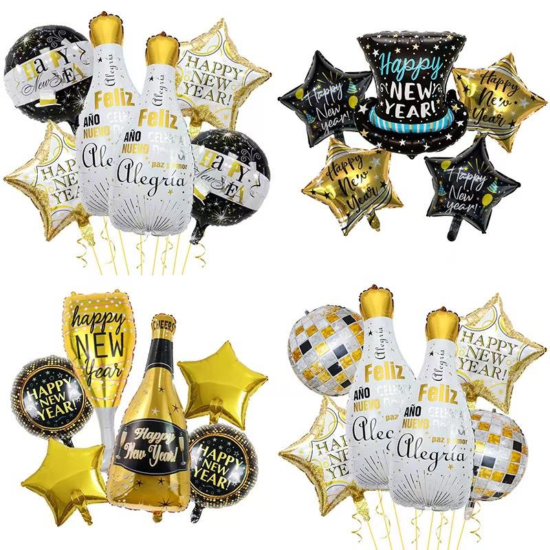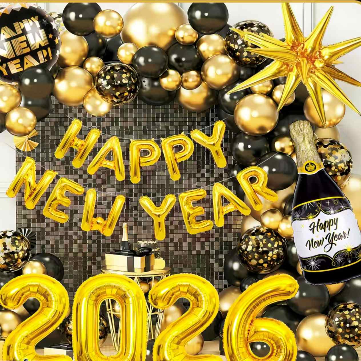Ajattele uudenvuoden teemaa. Siinä on folioilmapalloja, jotka näyttävät samppanjapulloilta. Se sisältää myös "2026" numeroilmapalloja, tähtikoristeita ja paljon muuta. Päävärit ovat musta-kulta tai kulta-valkoinen. Se on täynnä uudenvuoden juhlaa. Se voi helposti luoda ylellisen ja seremoniallisen uudenvuodenjuhlakohtauksen.